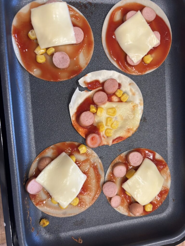 本日はクッキングで餃子の皮でピザを作りました!