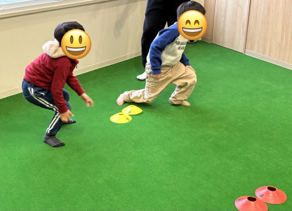 向かい合って指導員がいう色のマーカーを素早く聞いてタッチして戻るゲームをしました。