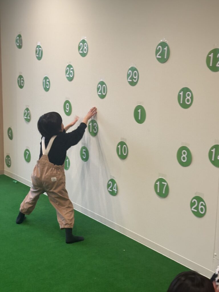床や壁に貼った「1〜10」などの数字カードを、できるだけ早く順番にタッチしていくゲームです。