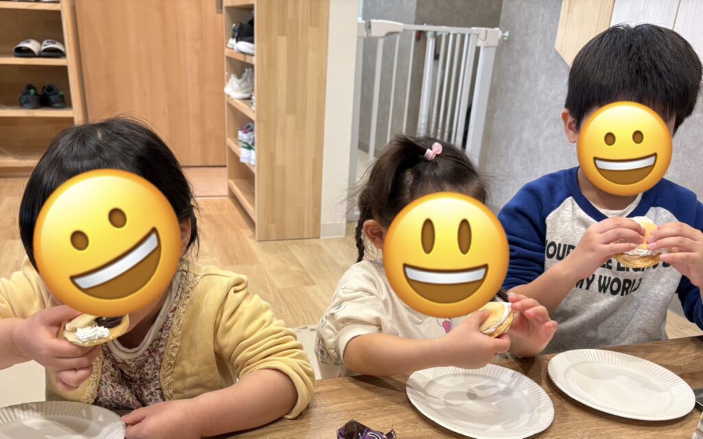 餡を絞り出す作業では力が弱くて絞り出せない子に他のお友だちが助けてくれるなど助け合う場面を見ることができました。